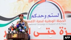 胡塞武装军事发言人萨雷亚在萨那就在红海袭击两艘商船事件发表声明。(2023年12月15日)