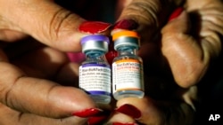 资料照片:一名护士拿着辉瑞/生物科技公司的COVID-19疫苗针剂,一瓶用于5到11岁儿童,另一瓶用于成年人。(2022年2月8日)