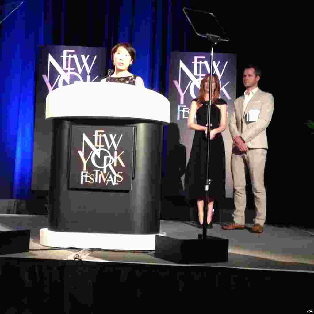 樊冬宁在发表得奖感言时感谢美国之音制作团队并将此片献给所有的二战老兵(美国之音 John Lippma 拍摄)