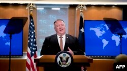 美国国务卿蓬佩奥在国务院举行的记者会上讲话。(2020年7月15日)