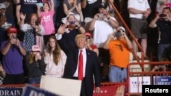川普提到两家被他指责报道“假新闻”的电视台,人群报以嘲笑声。川普说,他对媒体对他任职100天的报道的评分是“远远不及格”。