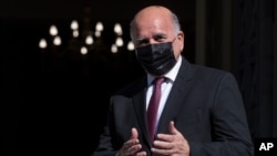 资料照片:伊拉克外交部长福阿德·侯赛因于 2021 年 2 月 12 日星期五抵达雅典与希腊外交部长会面时做手势。(美联社照片/Petros Giannakouris)